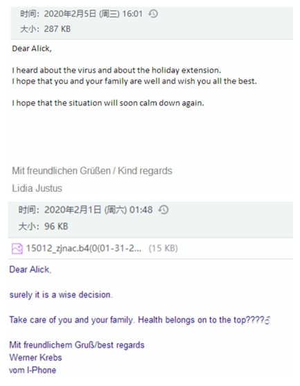 作為業務一線的業務部門,業務六部的客戶分布在美國,德國,意大利,荷蘭等國家,在得知疫情的第一時間,各種問候的郵件就雪花片一般地飛來,因為假期在家,業務員沒有第一時間看到郵件,客人就通過微信,甚至直接電話前來詢問是否平安。