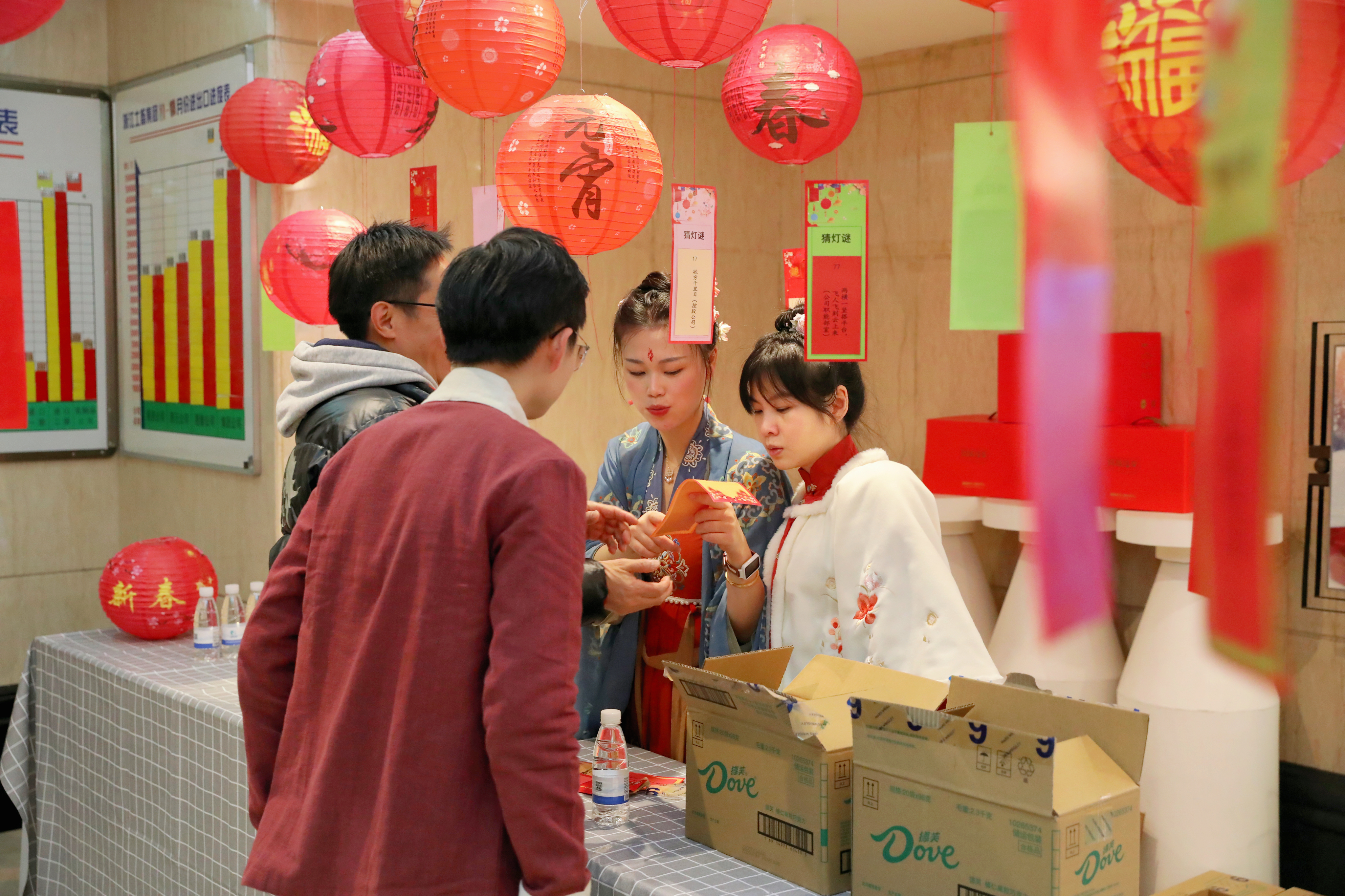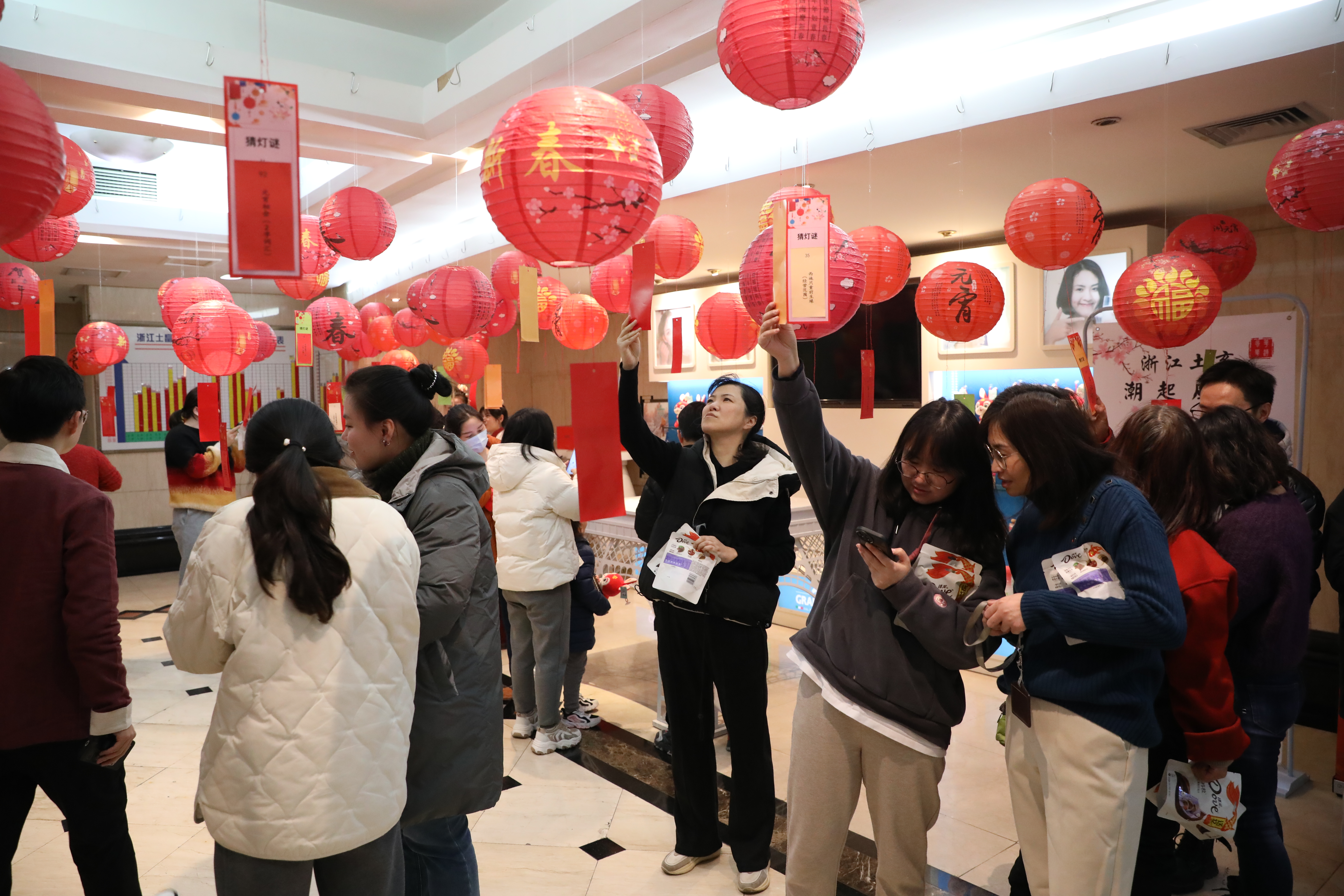 2月3日中午,浙江土畜工會組織開展元宵猜燈謎活動,公司三樓人頭攢動、熱鬧非凡,廳里錯落別致懸掛了一盞盞喜慶的紅燈籠,燈下都有五光十色的謎箋,吸引了許多員工駐足競猜,有的看著謎面低頭沉思,有的與同伴相互討論,領獎桌旁也是絡繹不絕。紅紅火火燈籠與熙熙攘攘的人群交相輝映,洋溢著濃濃的“土畜年味兒”。